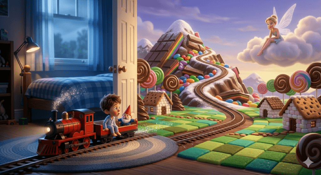දුම්රියෙන් පිටත, භූ දර්ශනය තරමක් වෙනස් විය. එකවර ම දුම්රිය චොකලට් හා කැවිලි වලින් නිර්මාණය වූ කන්දක් වැනි ස්ථානයකට නැග ගෙන ගියේ ය. කඳු මුදුනේ සුදු සීනි කුඩු ඉස තිබුණා. අනතුරු ව විශාල චොක්ලට් ගස් සහ කුකීස් වලින් සාදන ලද නිවාස සහිත හරිත තැනිතලාවකට ගමන ගියේ ය. ලස්සන සුරංගනාවක් අහසේ රැඳුණු සුදු වලාකුළක් මත වාඩි වී, එහි සිදු වන දේ සතුටින් බලා සිටියා ය.