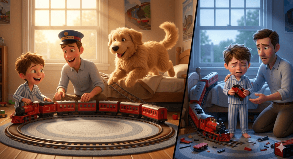 හදිසියේ ම මහා හයියෙන් බුරමින් කුස්සිය දෙසින් දුවගෙන පැමිණි දිගු ලෝම සහිත ‘වින්ඩි’, රේල් පීලි මත ධාවනය වෙමින් තිබූ සෙල්ලම් දුම්රිය මත උද්යෝගිමත් ලෙස පතිත විය. බලු සුරතලා විසින් ඌගේ දැනුමේ හැටියට මෙය කදිම සෙල්ලම් බඩුවක් ලෙස තේරුම් ගත්තා විය හැකිය. දැන්, දුම්රිය පීලි පැනීමෙන් සම්පූර්ණයෙන් ම ඉවතට වැටී ඇත. දුම්රිය අනතුර දුටු ඒ අසල සිටි ආධාරකරුවන් වන මව සහ පියා බෙනී පසුපස දිව ගියහ.