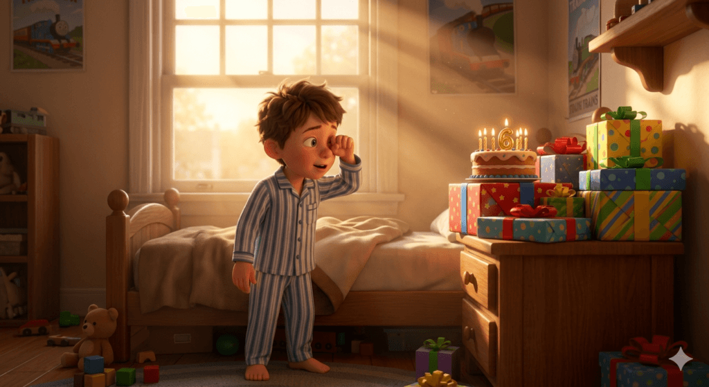 තවමත් සම්පූර්ණයෙන් අවසන් නොවූ නිදිමත සමඟින්, ඔහු උදේ පාන්දරින් ම අවදි වී කෑම කාමරයට එන විට, මේසය මත ඒ වන විටත් වර්ණවත් කඩදාසිවලින් ඔතා ඇති තෑගි ගොඩක් තිබුණි. කුඩා උපන් දින කාඩ් පත්, රන් හෝ රිදී සීනුවලට අමුණා ඇත. ඔහුගේ පියා සහ මව ඒ වන විටත් අවදි වී ඔහු එන තුරු බලා සිටියෝ ය. මේසය මත ඉටි පන්දම් හයක් දැල්වූ විචිත්රවත් උපන් දින කේක් එකක් විය. ඔහුගේ දෙමාපියන් ඒ අවට, මල් මාලා සහ බැලුන වලින් අලංකාර ලෙස සරසා තිබූ අතර, කුඩා පිරිමි ළමයා ඒ දැක ඇත්තටම පුදුම වුණි.