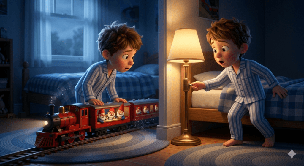 මධ්යම රාත්රියේ ඔහු හදිසියේ ම අවදි වූයේ අමුතු ශබ්දයකිනි. ඒත් කෝ මෙතන මේසය උඩින් තියපු දුම්රිය?
