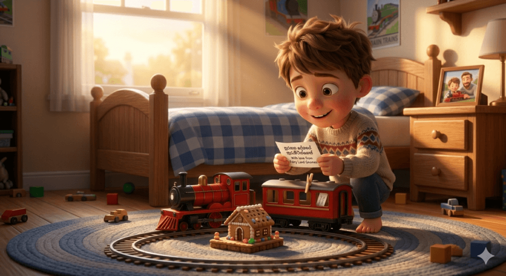 සුරඟන දේශයට ගිය ඔබේ පුංචි චාරිකාවෙන් ඔබ සතුටට පත් වූ බව අපි බලාපොරොත්තු වෙමු. ඒ අනුව ඔබට සුවිශේෂි උපන්දින ත්යාගයක් ලබා දීමට අපි වාසනාවන්ත වුණා. ඉතින් අපි ඔබේ ලස්සන දුම්රිය එන්ජිම අලුත්වැඩියා කර නැවත පිළිවෙලට තැබුවා. අපි ඔයත් එක්ක සුරඟන දේශයට ගොස් සෙල්ලම් කරපු බවක් කවදාකවත් ඔයාගේ දෙමාපියන්ට කියන්න එපා. ඔවුන් ඔබව කෙසේවත් විශ්වාස කරන්නේ නැති වේවි. දුම්රිය එන්ජිම අලුත්වැඩියා කළේ කවුරුන්ද කියා ඔබ මෙන් ම ඔවුන් ද නිසැකවම පුදුමයට පත් වනු ඇති. ඔවුන්ට අනුමාන කිරීමට ඉඩ දෙන්න! කෙසේ වුණත් ටික දවසක් යද්දි සමහරවිට ඔබටත් ඉක්මනින් ම මේ ගැන අමතක වෙලා යාවි. මේ විදිහට ම අපි දරුවන් වෙත පැමිණෙන්නේ බොහෝ විට සිතිවිල්ලෙන් සහ සිහිනයෙන් පමණයි. ඔබේ සෙල්ලම් දුම්රිය පරිහරණය කිරීමට ලබා දී අප වෙත දැක්වූ කාරුණික බව අපි ඉතාම අගය කරනවා. එය ජීවිත කාලය පුරා ඔබේ වටිනා ධනයක් ලෙස සුරක්ෂිත කරගනු ඇතැයි විශ්වාස කරනවා. අපි අනිවාර්යයෙන්ම නැවත හමුවෙමු.”