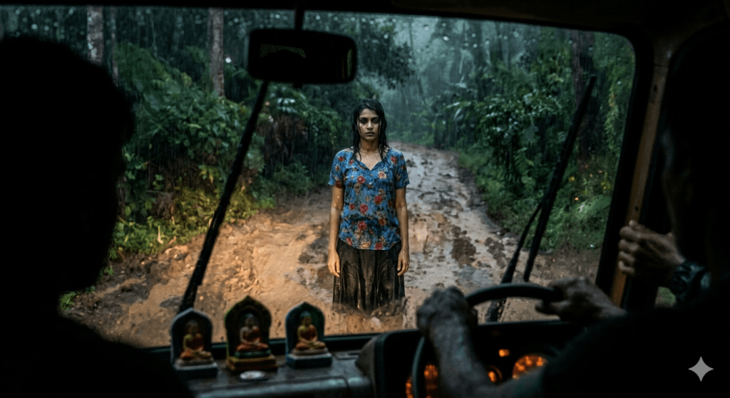 හදිසියේම පාර මැද කාන්තාවක් පෙනී සිටියාය. ගුණපාල බ්රේක් තද කළේය. ලොරිය ලිස්සා ගොස් නතර විය. ඇය නමින් ආන්යා ය. ඇය මල් වැටුණු තුනී හැට්ටයකින් සැරසී සිටි අතර, තම රෝගී දරුවාට බෙහෙත් ගැනීමට උදව් ඉල්ලුවාය. ඇය මහේෂ් සහ ගුණපාල මැද වාඩි වූවාය. ඇගේ සිරුරෙන් අමුතු සීතලක් වහනය විය.